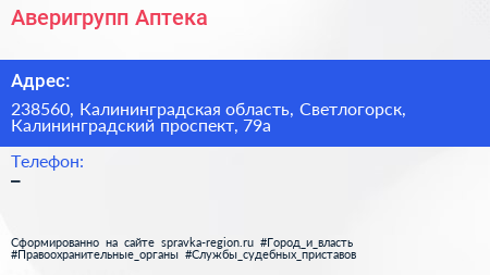 Аверигрупп, Аптека по адресу 238560, Калининградская область, Светлогорск, Калининградский проспект, 79а в дальнейшем Организация, размещена в следующих категориях:
