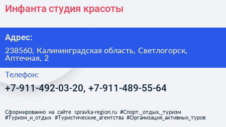 Инфанта, студия красоты по адресу 238560, Калининградская область, Светлогорск, Аптечная, 2 в дальнейшем Организация, размещена в следующих категориях: