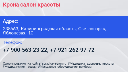 Крона, салон красоты по адресу 238563, Калининградская область, Светлогорск, Яблоневая, 10 в дальнейшем Организация, размещена в следующих категориях:
