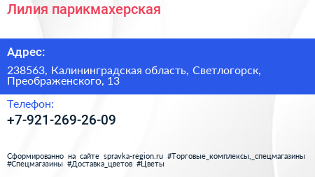 Лилия, парикмахерская по адресу 238563, Калининградская область, Светлогорск, Преображенского, 13 в дальнейшем Организация, размещена в следующих категориях: