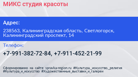 МИКС, студия красоты по адресу 238563, Калининградская область, Светлогорск, Калининградский проспект, 14 в дальнейшем Организация, размещена в следующих категориях: