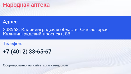 Народная, аптека по адресу 238563, Калининградская область, Светлогорск, Калининградский проспект, 88 в дальнейшем Организация, размещена в следующих категориях: