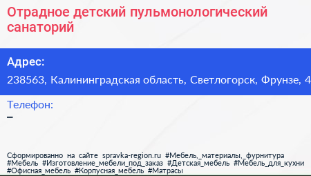 Отрадное, детский пульмонологический санаторий по адресу 238563, Калининградская область, Светлогорск, Фрунзе, 4 в дальнейшем Организация, размещена в следующих категориях: