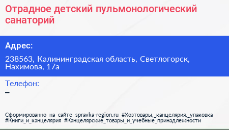 Отрадное, детский пульмонологический санаторий по адресу 238563, Калининградская область, Светлогорск, Нахимова, 17а в дальнейшем Организация, размещена в следующих категориях: