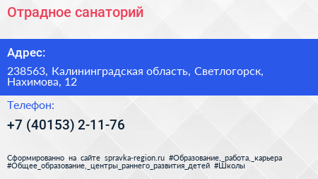 Отрадное, санаторий по адресу 238563, Калининградская область, Светлогорск, Нахимова, 12 в дальнейшем Организация, размещена в следующих категориях: