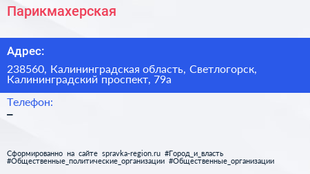 Парикмахерская по адресу 238560, Калининградская область, Светлогорск, Калининградский проспект, 79а в дальнейшем Организация, размещена в следующих категориях:
