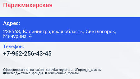 Парикмахерская по адресу 238563, Калининградская область, Светлогорск, Мичурина, 4 в дальнейшем Организация, размещена в следующих категориях: