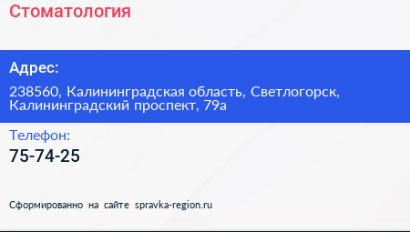 Стоматология по адресу 238560, Калининградская область, Светлогорск, Калининградский проспект, 79а в дальнейшем Организация, размещена в следующих категориях: