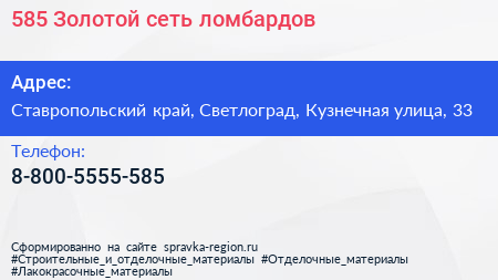585*Золотой, сеть ломбардов по адресу Ставропольский край, Светлоград, Кузнечная улица, 33 в дальнейшем Организация, размещена в следующих категориях: