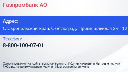 Газпромбанк, АО по адресу Ставропольский край, Светлоград, Промышленная 2-я, 12 в дальнейшем Организация, размещена в следующих категориях: