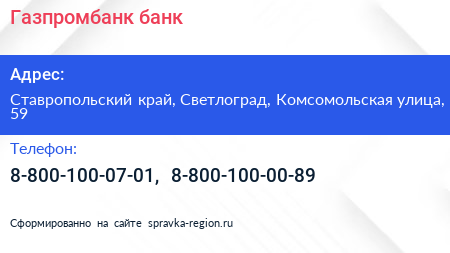 Газпромбанк, банк по адресу Ставропольский край, Светлоград, Комсомольская улица, 59 в дальнейшем Организация, размещена в следующих категориях: