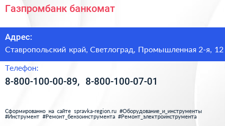 Газпромбанк, банкомат по адресу Ставропольский край, Светлоград, Промышленная 2-я, 12 в дальнейшем Организация, размещена в следующих категориях: