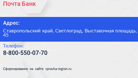 Почта Банк по адресу Ставропольский край, Светлоград, Выставочная площадь, 45 в дальнейшем Организация, размещена в следующих категориях: