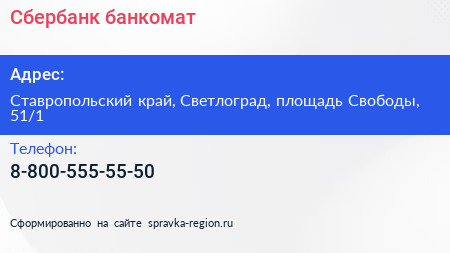 Сбербанк, банкомат по адресу Ставропольский край, Светлоград, площадь Свободы, 51/1 в дальнейшем Организация, размещена в следующих категориях:
