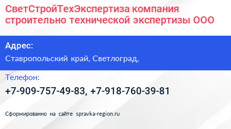 СветСтройТехЭкспертиза, компания строительно-технической экспертизы, ООО по адресу Ставропольский край, Светлоград, в дальнейшем Организация, размещена в следующих категориях: