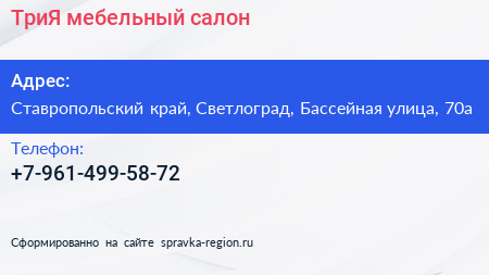 ТриЯ, мебельный салон по адресу Ставропольский край, Светлоград, Бассейная улица, 70а в дальнейшем Организация, размещена в следующих категориях: