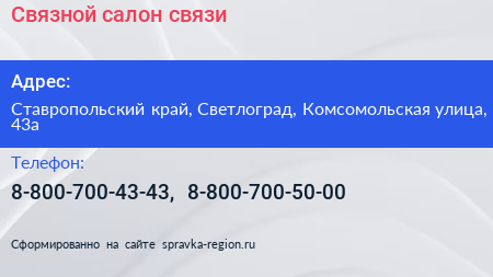 Связной, салон связи по адресу Ставропольский край, Светлоград, Комсомольская улица, 43а в дальнейшем Организация, размещена в следующих категориях: