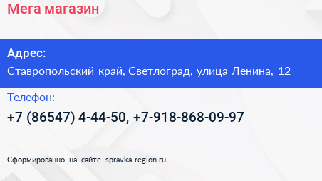 Мега, магазин по адресу Ставропольский край, Светлоград, улица Ленина, 12 в дальнейшем Организация, размещена в следующих категориях: