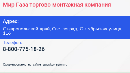 Мир Газа, торгово-монтажная компания по адресу Ставропольский край, Светлоград, Октябрьская улица, 116 в дальнейшем Организация, размещена в следующих категориях: