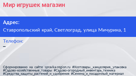 Мир игрушек, магазин по адресу Ставропольский край, Светлоград, улица Мичурина, 1 в дальнейшем Организация, размещена в следующих категориях: