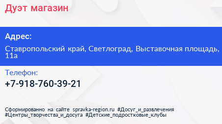 Дуэт, магазин по адресу Ставропольский край, Светлоград, Выставочная площадь, 11а в дальнейшем Организация, размещена в следующих категориях: