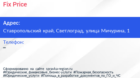 Fix Price по адресу Ставропольский край, Светлоград, улица Мичурина, 1 в дальнейшем Организация, размещена в следующих категориях: