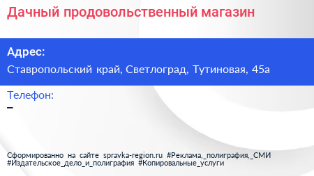 Дачный, продовольственный магазин по адресу Ставропольский край, Светлоград, Тутиновая, 45а в дальнейшем Организация, размещена в следующих категориях: