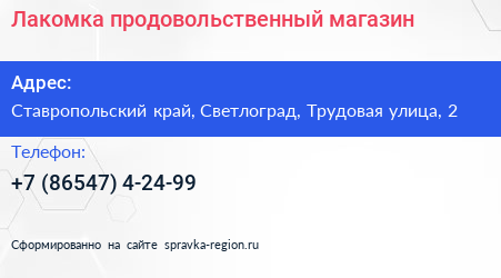 Лакомка, продовольственный магазин по адресу Ставропольский край, Светлоград, Трудовая улица, 2 в дальнейшем Организация, размещена в следующих категориях: