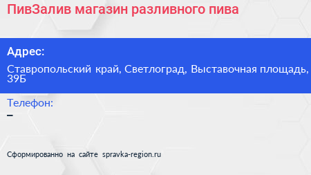 ПивЗалив, магазин разливного пива по адресу Ставропольский край, Светлоград, Выставочная площадь, 39Б в дальнейшем Организация, размещена в следующих категориях: