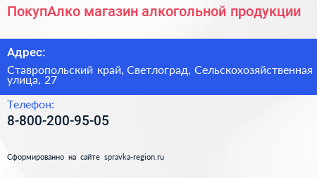 ПокупАлко, магазин алкогольной продукции по адресу Ставропольский край, Светлоград, Сельскохозяйственная улица, 27 в дальнейшем Организация, размещена в следующих категориях: