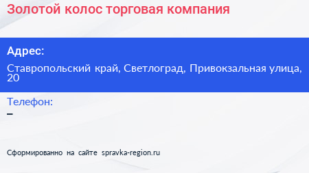 Золотой колос, торговая компания по адресу Ставропольский край, Светлоград, Привокзальная улица, 20 в дальнейшем Организация, размещена в следующих категориях:
