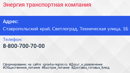 Энергия, транспортная компания по адресу Ставропольский край, Светлоград, Техническая улица, 1Б в дальнейшем Организация, размещена в следующих категориях: