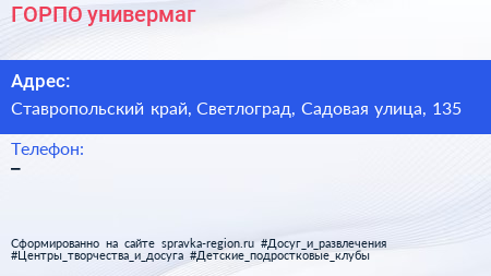 ГОРПО, универмаг по адресу Ставропольский край, Светлоград, Садовая улица, 135 в дальнейшем Организация, размещена в следующих категориях:
