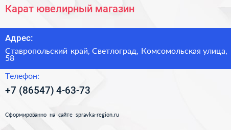 Карат, ювелирный магазин по адресу Ставропольский край, Светлоград, Комсомольская улица, 58 в дальнейшем Организация, размещена в следующих категориях: