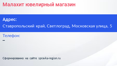 Малахит, ювелирный магазин по адресу Ставропольский край, Светлоград, Московская улица, 5 в дальнейшем Организация, размещена в следующих категориях: