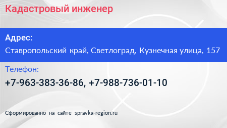 Кадастровый инженер по адресу Ставропольский край, Светлоград, Кузнечная улица, 157 в дальнейшем Организация, размещена в следующих категориях:
