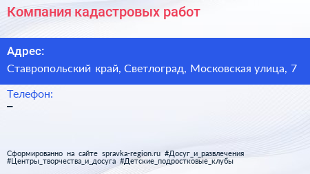 Компания кадастровых работ по адресу Ставропольский край, Светлоград, Московская улица, 7 в дальнейшем Организация, размещена в следующих категориях: