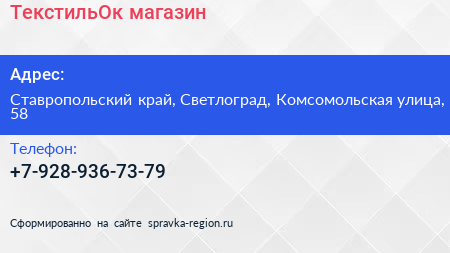 ТекстильОк, магазин по адресу Ставропольский край, Светлоград, Комсомольская улица, 58 в дальнейшем Организация, размещена в следующих категориях:
