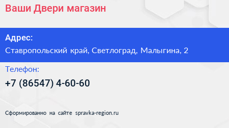Ваши Двери, магазин по адресу Ставропольский край, Светлоград, Малыгина, 2 в дальнейшем Организация, размещена в следующих категориях: