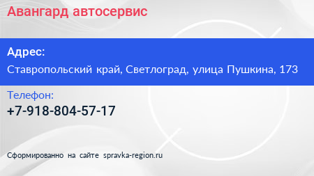 Авангард, автосервис по адресу Ставропольский край, Светлоград, улица Пушкина, 173 в дальнейшем Организация, размещена в следующих категориях: