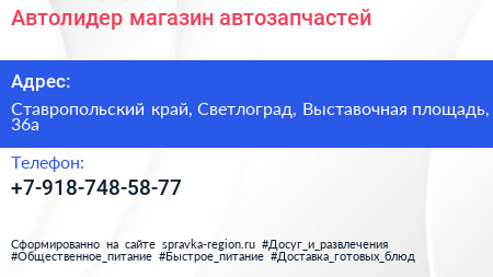 Автолидер, магазин автозапчастей по адресу Ставропольский край, Светлоград, Выставочная площадь, 36а в дальнейшем Организация, размещена в следующих категориях: