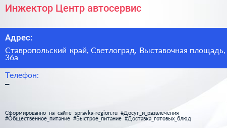 Инжектор-Центр, автосервис по адресу Ставропольский край, Светлоград, Выставочная площадь, 36а в дальнейшем Организация, размещена в следующих категориях: