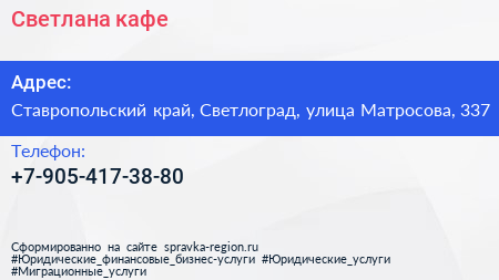 Светлана, кафе по адресу Ставропольский край, Светлоград, улица Матросова, 337 в дальнейшем Организация, размещена в следующих категориях: