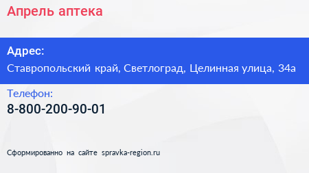 Апрель, аптека по адресу Ставропольский край, Светлоград, Целинная улица, 34а в дальнейшем Организация, размещена в следующих категориях: