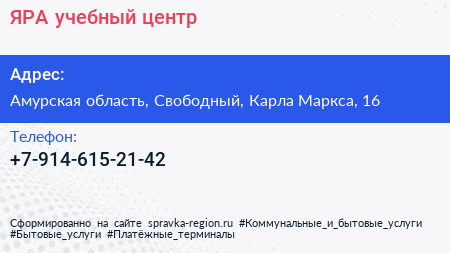 ЯРА, учебный центр по адресу Амурская область, Свободный, Карла Маркса, 16 в дальнейшем Организация, размещена в следующих категориях: