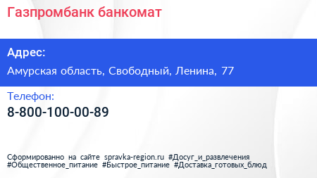 Газпромбанк, банкомат по адресу Амурская область, Свободный, Ленина, 77 в дальнейшем Организация, размещена в следующих категориях: