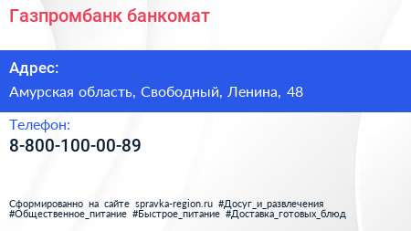 Газпромбанк, банкомат по адресу Амурская область, Свободный, Ленина, 48 в дальнейшем Организация, размещена в следующих категориях: