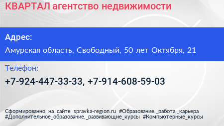 КВАРТАЛ, агентство недвижимости по адресу Амурская область, Свободный, 50 лет Октября, 21 в дальнейшем Организация, размещена в следующих категориях: