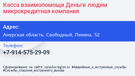 Касса взаимопомощи Деньги людям, микрокредитная компания по адресу Амурская область, Свободный, Ленина, 52 в дальнейшем Организация, размещена в следующих категориях: