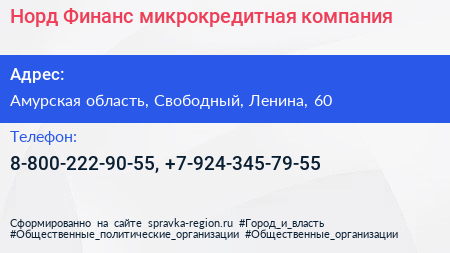 Норд Финанс, микрокредитная компания по адресу Амурская область, Свободный, Ленина, 60 в дальнейшем Организация, размещена в следующих категориях: